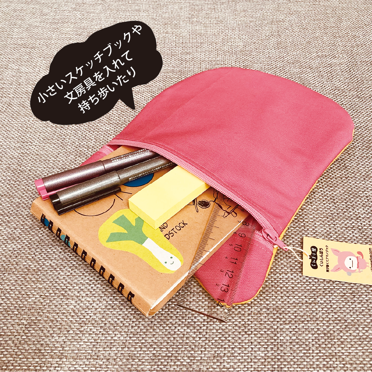 ちょっと大きめのサイズなので小さいスケッチブックやペン、定規など文房具入れにしたり携帯用のおやつを入れたり。